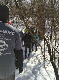 The Course: Almost all single track, very snowy and slick, and surprisingly technical considering the snow. I supposed I expected the woodsy parts of the run to be less technical since the deep and slippery ground cover was already a formidable obstacle. I'm afraid I cannot comment on the scenery much, as I was so focused on my footing that I barely looked around, even when the sun wasn't scorching my eyeballs. My biggest negative is that the distances weren't marked. Being stuck in single file is just a natural hazard of trail running, and I can't really hold that against any particular event. I also think the course might have been short of 5k: my GPS tracking had the course at 2.6 miles, and despite being in the woods where sometimes signal is hard to find, my route map looks pretty accurate. Trying to give Muddy Monk the benefit of the doubt, but definitely a little suspicious on this one.